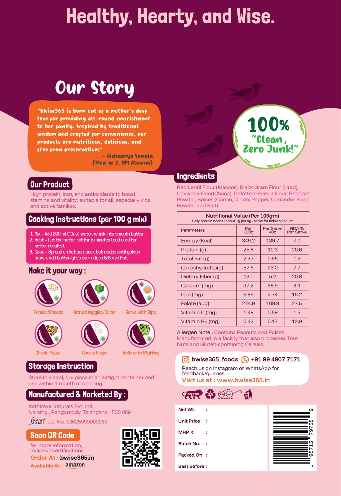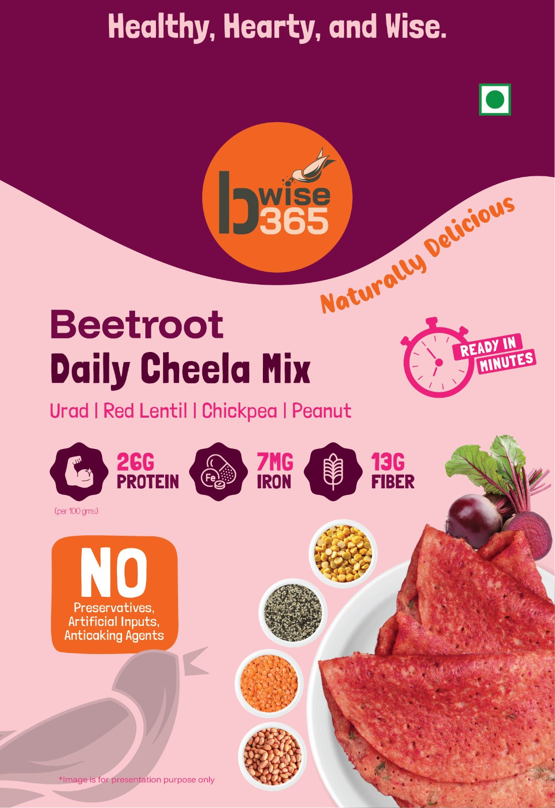 Make a quick, nourishing cheela in minutes with bWise365 Beetroot Daily Cheela Mix. Built for daily routines, this mix combines traditional pulse flours with beetroot for a naturally delicious meal that works for both kids and adults.
